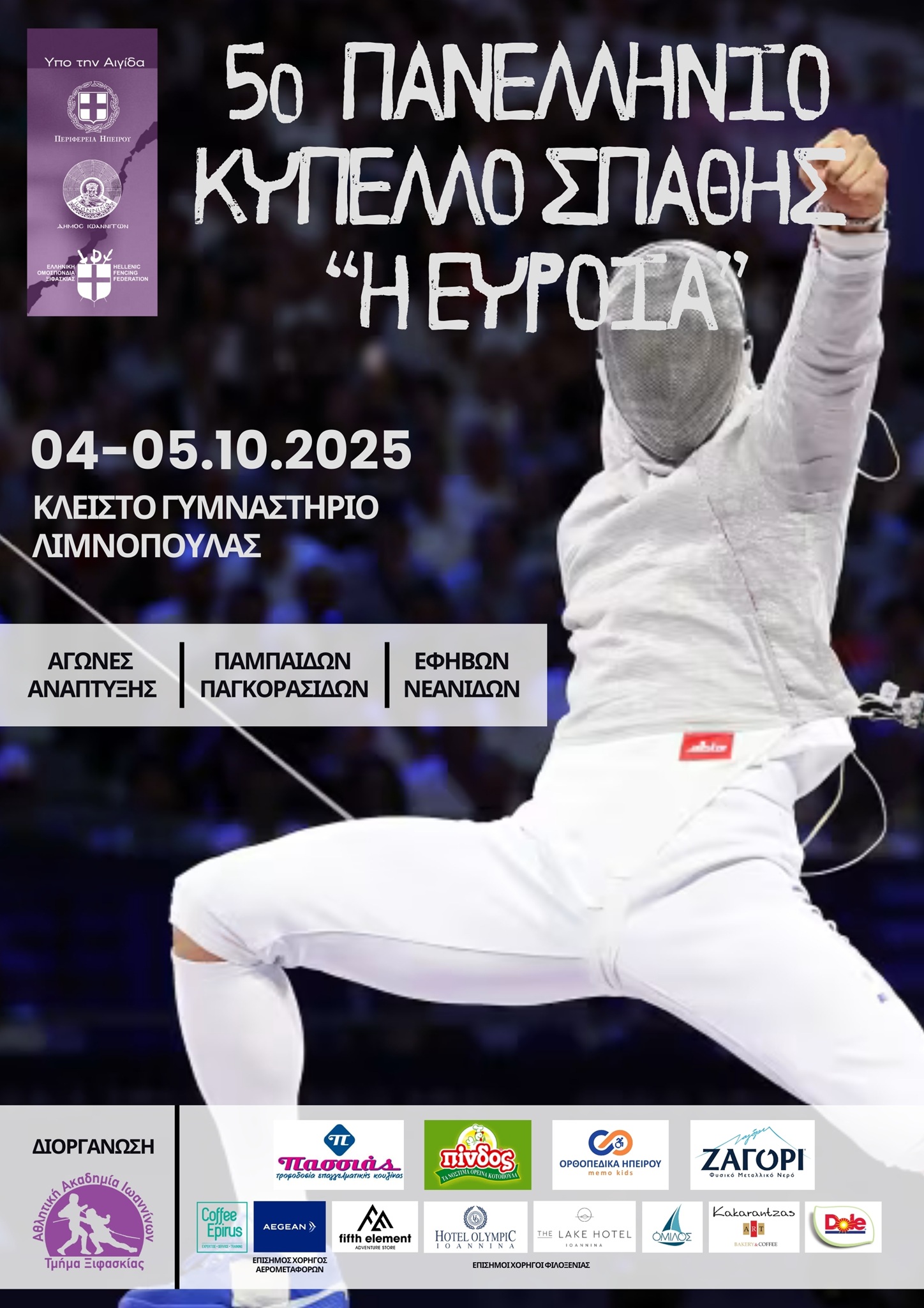 Η Αθλητική Ακαδημία Ιωαννίνων «Η Εύροια», σε συνεργασία με την Ελληνική Ομοσπονδία Ξιφασκίας, διοργανώνει για 5η συνεχόμενη χρονιά μια διοργάνωση υψηλού επιπέδου: το 5ο Πανελλήνιο Κύπελλο Ξιφασκίας – Σπάθη, στις 4–5 Οκτωβρίου 2025 στο Κλειστό Γυμναστήριο Λιμνοπούλας (ΠΕΑΚΙ). Θα συμμετάσχουν αθλητές και αθλήτριες από συλλόγους όλης της χώρας στις κατηγορίες U10, U13 και U17. Η διοργάνωση αναδεικνύει την πόλη των Ιωαννίνων ως σημείο αναφοράς για τον ελληνικό αθλητισμό και την ξιφασκία, ενισχύει την τοπική οικονομία και προσφέρει στους νέους αθλητές πολύτιμες αγωνιστικές εμπειρίες με ασφάλεια, οργάνωση και αθλητικό ήθος. Δήλωση…