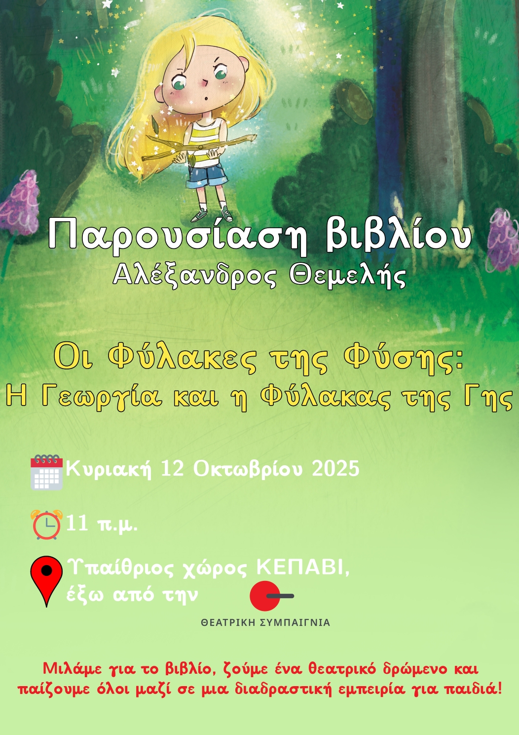 Οι Εκδόσεις Ελκυστής και ο συγγραφέας Αλέξανδρος Θεμελής προσκαλούν μικρούς και μεγάλους στην παρουσίαση του παιδικού βιβλίου «Οι Φύλακες της Φύσης: Η Γεωργία και η Φύλακας της Γης», την Κυριακή 12 Οκτωβρίου, στις 11:00 π.μ., στον υπαίθριο χώρο του ΚΕΠΑΒΙ (έξω από τη Θεατρική Συμπαιγνία). Η εκδήλωση θα περιλαμβάνει την παρουσίαση του βιβλίου από τον συγγραφέα, ανάγνωση αποσπασμάτων καθώς και θεατρικό δρώμενο – διαδραστικό παιχνίδι εμπνευσμένα από το βιβλίο, στα οποία θα συμμετέχουν οι μαθητές του εργαστηρίου της Θεατρικής Συμπαιγνίας αλλά και όλα τα παιδιά που θα παρευρεθούν. Τον συντονισμό…