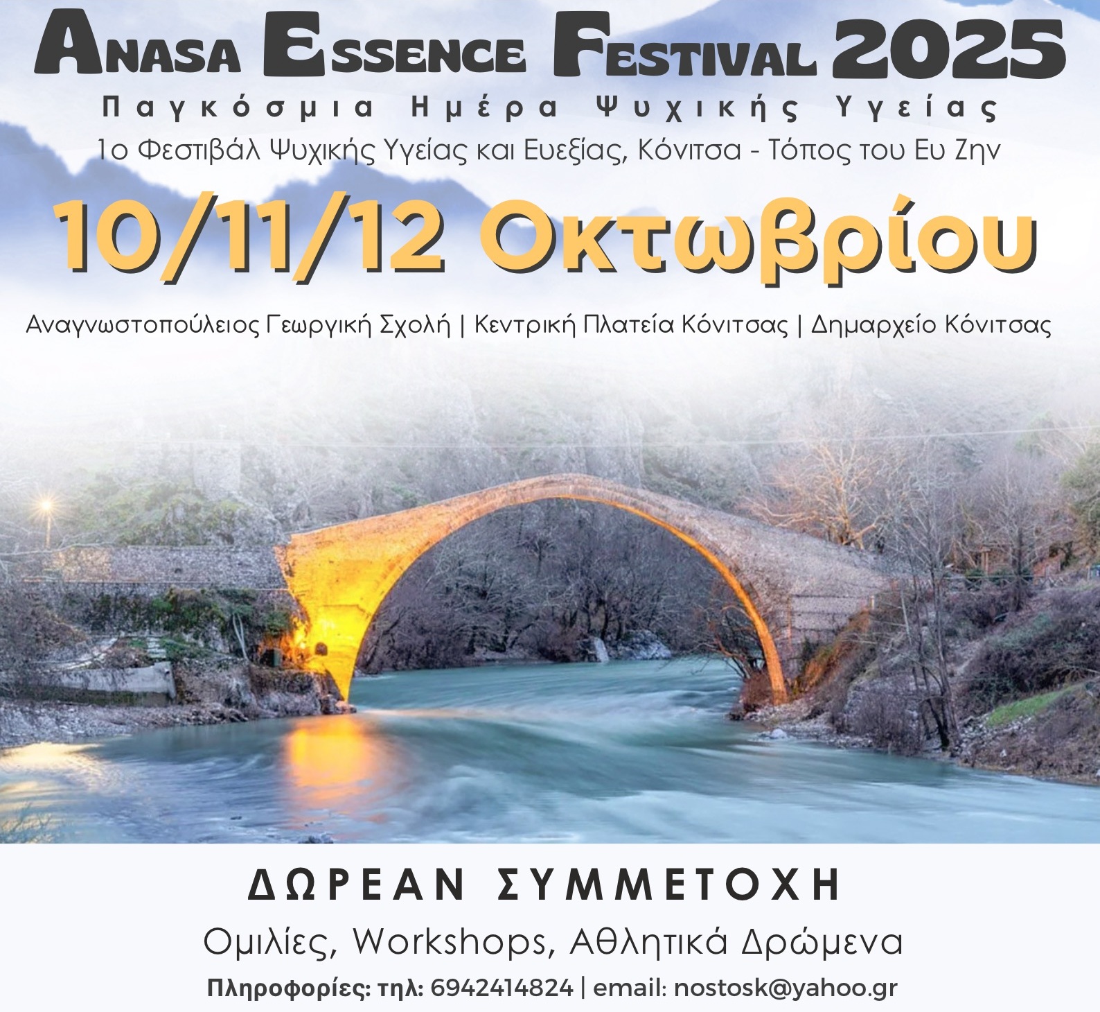 Το Οικοτροφείο «Νόστος» της Εταιρείας Ψυχοκοινωνικής Έρευνας και Παρέμβασης (Ε.Ψ.Ε.Π.), διοργανώνει το Anasa Essence Festival 2025 – 1ο Φεστιβάλ Ψυχικής Υγείας & Ευεξίας «Κόνιτσα – Τόπος του Ευ Ζην», από τις 10 έως τις 12 Οκτωβρίου 2025, στην Κόνιτσα Ιωαννίνων. Το φεστιβάλ επιδιώκει να αναδείξει τη στενή σχέση και τη σημασία και αξία της θετικής αλληλεπίδρασης ανάμεσα στον άνθρωπο, τον τόπο και την ψυχική υγεία. Με αναφορά την Κόνιτσα, έναν τόπο με βαθιά ιστορική, κοινωνική και πολιτισμική διαδρομή και συνέχεια, το φεστιβάλ «προσκαλεί» το κοινό σε μία ολιστική εμπειρία που…