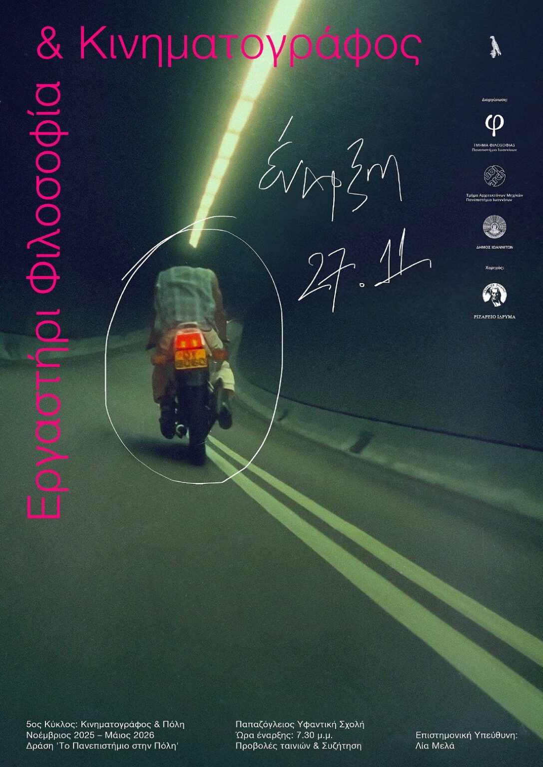 Το Εργαστήρι Φιλοσοφία & Κινηματογράφος του Τμήματος Φιλοσοφίας του Πανεπιστημίου Ιωαννίνων σε συνεργασία με το Τμήμα Αρχιτεκτόνων Μηχ/κών Πανεπιστημίου Ιωαννίνων και το Δήμο Ιωαννιτών παρουσιάζουν τον 5ο κύκλο προβολών και συζήτησης, στο πλαίσιο της δράσης «Το Πανεπιστήμιο στην Πόλη», στην Παπαζόγλειο Υφαντική Σχολή. Ώρα έναρξης δράσεων: 7.30 μ.μ. Πρόγραμμα προβολών & Προσκεκλημένων ομιλιών 18/12 O Παράδεισος έπεσε στη Γη / It must be heaven Elia Suleiman, 2017 Παρουσίαση: Χρυσούλα Μητσοπούλου (Πάντειο Παν/μιο) Στάθης Παπασταθόπουλος (Παν/μιο Ιωαννίνων) 15/01 Fallen Angels / Wong Kar-wai, 1995 Παρουσίαση: Άγγελος Αλετράς (σκηνοθέτης, θεωρητικός του κιν/φου) Γιάννης Ματσάγκας (σκηνοθέτης,…