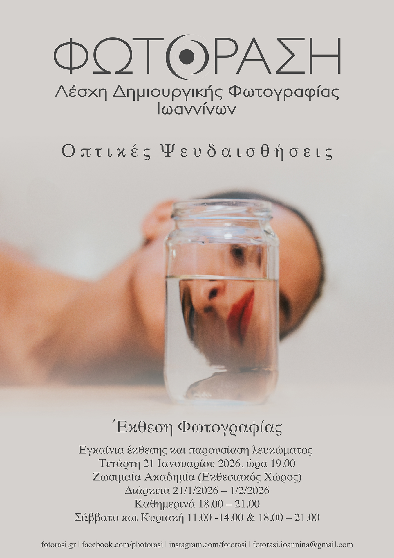 Η Λέσχη Δημιουργικής Φωτογραφίας Ιωαννίνων Φωτόραση» με χαρά ανακοινώνει τα εγκαίνια της έκθεσης φωτογραφίας και την παρουσίαση Φωτογραφικού Λευκώματος με τίτλο «Οπτικές Ψευδαισθήσεις». Η έκθεση ανοίγει τις πύλες της στο κοινό την 21η Ιανουαρίου και ώρα 19.00, στον εκθεσιακό χώρο της Ζωσιμαίας Ακαδημίας, προσκαλώντας τους επισκέπτες σε ένα εικαστικό ταξίδι όπου τίποτα δεν είναι όπως φαίνεται. Σε έναν κόσμο που κυριαρχείται από την εικόνα, η έκθεση “Οπτικές Ψευδαισθήσεις” έρχεται να αμφισβητήσει τη βεβαιότητα της όρασης. Μέσα από τον φακό των μελών της «Φωτόρασης», η πραγματικότητα διαστρεβλώνεται, ανασυντίθεται και παρουσιάζεται υπό…