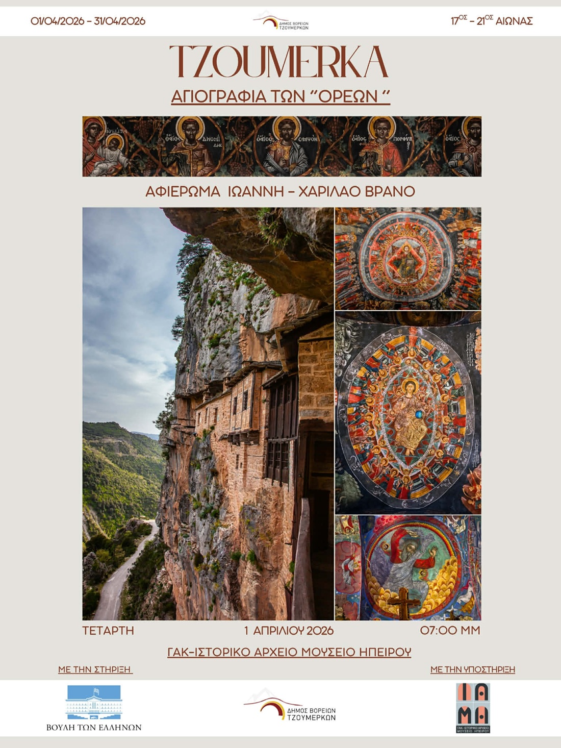 Από την Αθήνα και τη Λυκόβρυση – Πεύκη, η έκθεση «Tzoumerka – Αγιογραφία των “Ορέων”» συνεχίζει τη διαδρομή της και φτάνει στα Γιάννενα, μεταφέροντας μαζί της την ιστορία και τη συνέχεια της αγιογραφικής παράδοσης των Τζουμέρκων. Η έκθεση θα φιλοξενηθεί στον εκθεσιακό χώρο των Γενικών Αρχείων του Κράτους – Ιστορικό Αρχείο Μουσείο Ηπείρου για όλο τον μήνα Απρίλιο, σε μια περίοδο με ιδιαίτερο συμβολισμό, καθώς συμπίπτει με το Πάσχα, συνδέοντας την παρουσίαση της αγιογραφικής τέχνης με το έντονο θρησκευτικό συναίσθημα των ημερών, αλλά και με την αυξημένη επισκεψιμότητα που καταγράφεται…