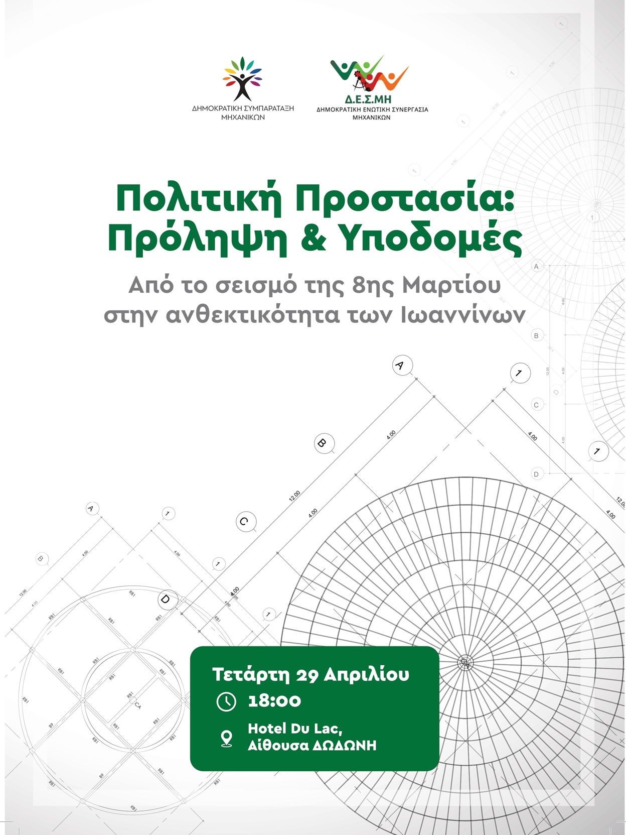 Η Δημοκρατική Ενωτική Συνεργασία Μηχανικών Ηπείρου – Λευκάδας (Δ.Ε.Σ.ΜΗ.) και η Δημοκρατική Συμπαράταξη Μηχανικών (ΔΗ.ΣΥ.Μ.) διοργανώνουν από κοινού την Τετάρτη 29 Απριλίου και ώρα 18:00, στην αίθουσα ΔΩΔΩΝΗ του Ξενοδοχείου DuLac εκδήλωση με τίτλο “Πολιτική Προστασία: Πρόληψη & Υποδομές. Από το σεισμό της 8ης Μαρτίου στην ανθεκτικότητα των Ιωαννίνων”. Η εκδήλωση επιδιώκει να αναδείξει κρίσιμα ζητήματα που αφορούν την ασφάλεια των κατοίκων, την κατάσταση των κτιρίων, την ετοιμότητα των υπηρεσιών, καθώς και την προστασία των δημόσιων υποδομών, των σχολείων και των μνημείων. Παράλληλα, αναδεικνύει τη συνολική ικανότητα της περιοχής μας να προλαμβάνει,…