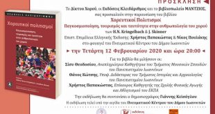 Από: Εβίτα Θεοχάρη Η «Μουσική Κερασιά» μία εκπομπή μουσικής και λόγου, για τον πολιτισμό με έμφαση στη δημοτική μουσική της Ελλάδας, σας προσφέρει κάθε Κυριακή, 13.00 – 14.00, μουσικά κεράσματα παρέα με εκλεκτούς καλεσμένους. Δημοτικό Ραδιόφωνο Ιωαννίνων 98,7 & dimotikoradiofono.gr Αύριο Κυριακή, 9/2/2020, η εκπομπή παρουσιάζει ένα νέο βιβλίο για τον χορό, “Χορευτικοί Πολιτισμοί – Παγκοσμιοποίηση, τουρισμός και ταυτότητα στην ανθρωπολογία του χορού“, μέσα από τη συνομιλία μου με έναν εκ των επιμελητών της ελληνικής έκδοσής του, τον κύριο Χρήστο Παπακώστα. Ο ίδιος είναι Επίκουρος Καθηγητής της Σχολής Φυσικής Αγωγής και Αθλητισμού του Εθνικού και Καποδιστριακού Πανεπιστημίου Αθηνών…