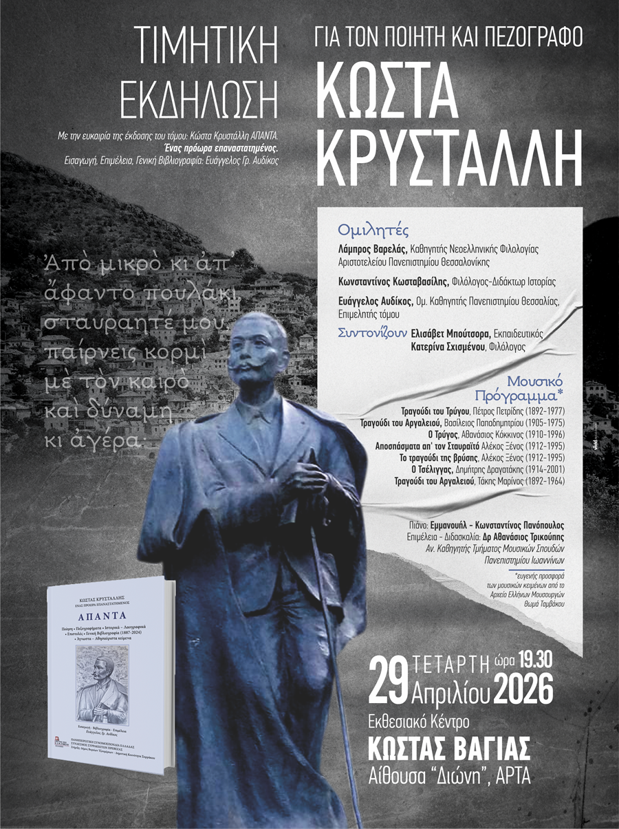 Τιμητική εκδήλωση για τον ποιητή Κώστα Κρυστάλλη συνδιοργανώνουν οι Δήμοι Αρταίων και Βορείων Τζουμέρκων την Τετάρτη 29 Απριλίου, στις 7.30 το απόγευμα, στην Αίθουσα «Διώνη» του Εκθεσιακού Κέντρου «Κώστας Βάγιας», στην Άρτα.